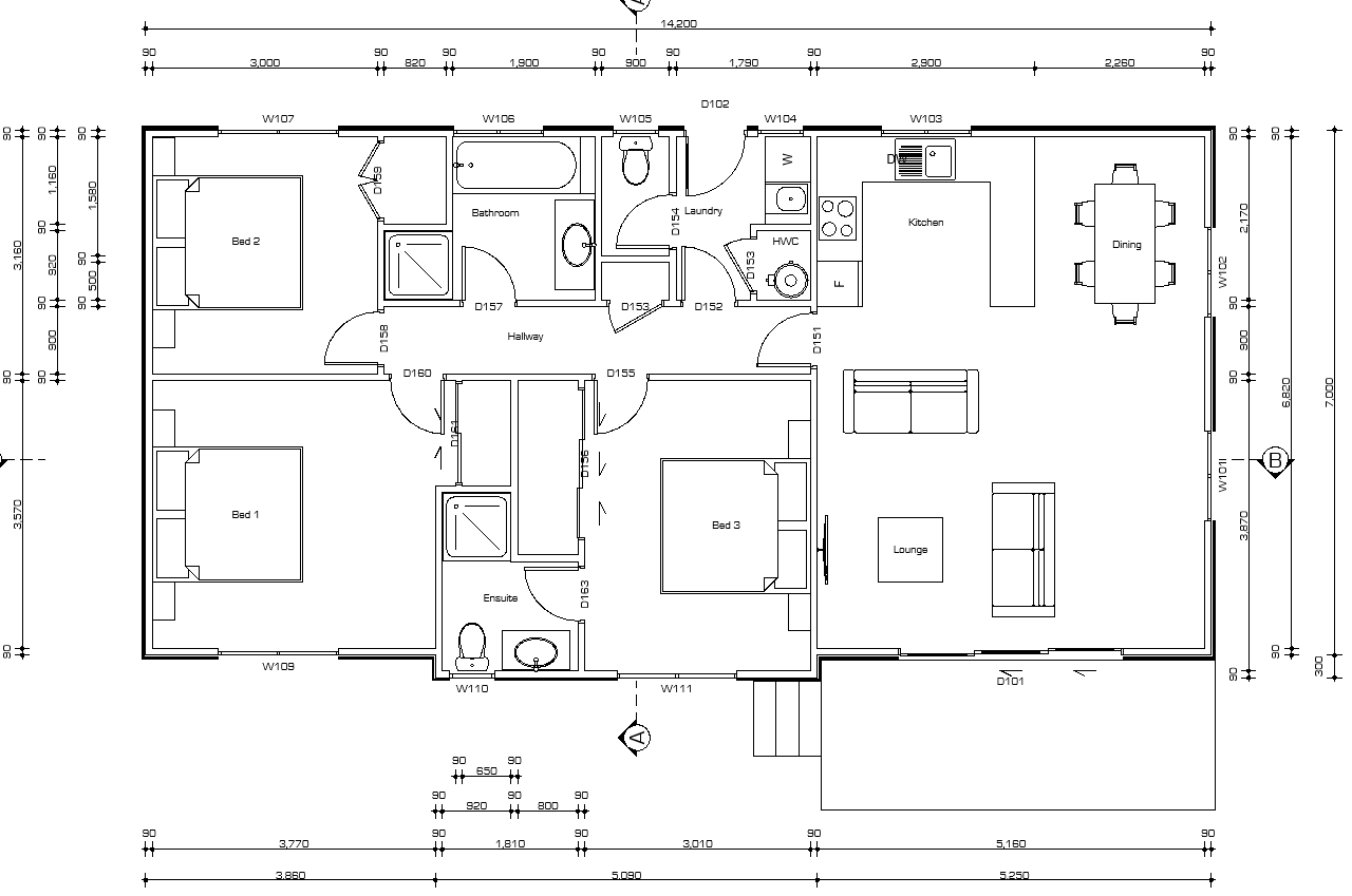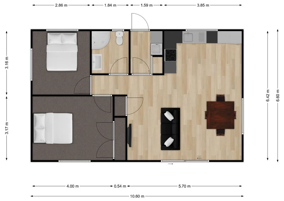 Our 69 square metre home includes two double bedrooms, a full sized bathroom, a full sized kitchen as well as a large open plan living/dining area allowing plenty of light in, and creating the opportunity for great in door-outdoor flow if a deck is constructed outside to give this home even more space.